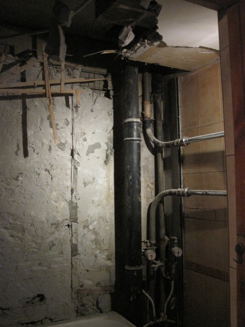 6.Прокладка нового воздуховода в санузле, кухне и коридоре. Обшивка воздуховода ГКЛ. Монтаж водопроводных и канализационных труб. Устройство сантехнического потайного люка в туалете.